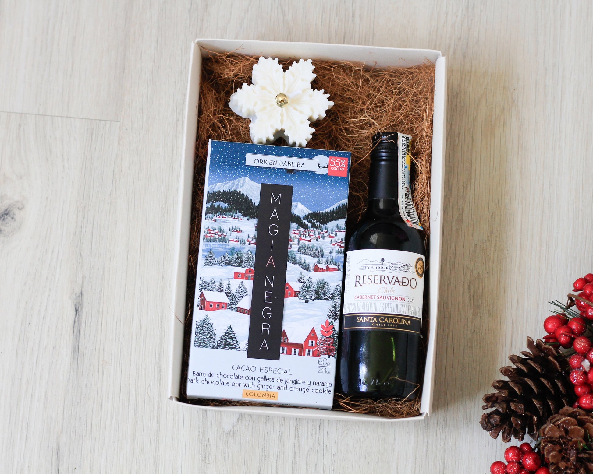 Un detalle inspirado en el invierno y la magia navideña. Incluye una vela en forma de copo de nieve, una barra de chocolate artesanal con galleta de jengibre y naranja, y una botella de vino tinto para brindar en esta temporada especial. Un regalo cálido, elegante y perfecto para compartir.